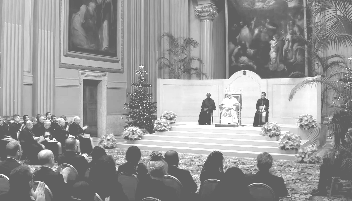 Après le discours d’introduction de l’ambassadeur chypriote George Poulides, doyen du Corps diplomatique, le Pape a pris la parole en anglais, s’inspirant des idées clés de l’ouvrage La Cité de Dieu de son maître spirituel saint Augustin pour sa réflexion. Ce dernier affirme que le chrétien, même s’il vise « la cité céleste », n’est pas étranger au monde politique et cherche à appliquer l’éthique chrétienne, inspirée des Écritures, au gouvernement civil.