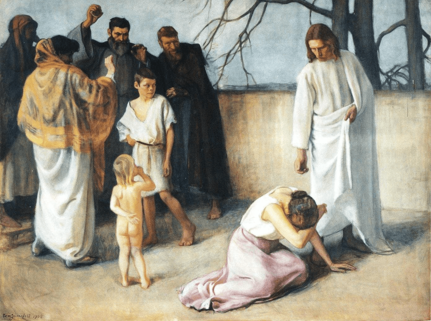 En ce temps-là, Jésus s’en alla au mont des Oliviers. Dès l’aurore, il retourna au Temple. Comme tout le peuple venait à lui, il s’assit et se mit à enseigner. Les scribes et les pharisiens lui amènent une femme qu’on avait surprise en situation d’adultère. Ils la mettent au milieu, et disent à Jésus : « Maître, cette femme a été surprise en flagrant délit d’adultère. Or, dans la Loi, Moïse nous a ordonné de lapider ces femmes-là. Et toi, que dis-tu ? » Ils parlaient ainsi pour le mettre à l’épreuve, afin de pouvoir l’accuser. Mais Jésus s’était baissé et, du doigt, il écrivait sur la terre. Comme on persistait à l’interroger, il se redressa et leur dit : « Celui d’entre vous qui est sans péché, qu’il soit le premier à lui jeter une pierre. » Il se baissa de nouveau et il écrivait sur la terre. Eux, après avoir entendu cela, s’en allaient un par un, en commençant par les plus âgés. Jésus resta seul avec la femme toujours là au milieu. Il se redressa et lui demanda : « Femme, où sont-ils donc ? Personne ne t’a condamnée ? » Elle répondit : « Personne, Seigneur. » Et Jésus lui dit : « Moi non plus, je ne te condamne pas. Va, et désormais ne pèche plus. »